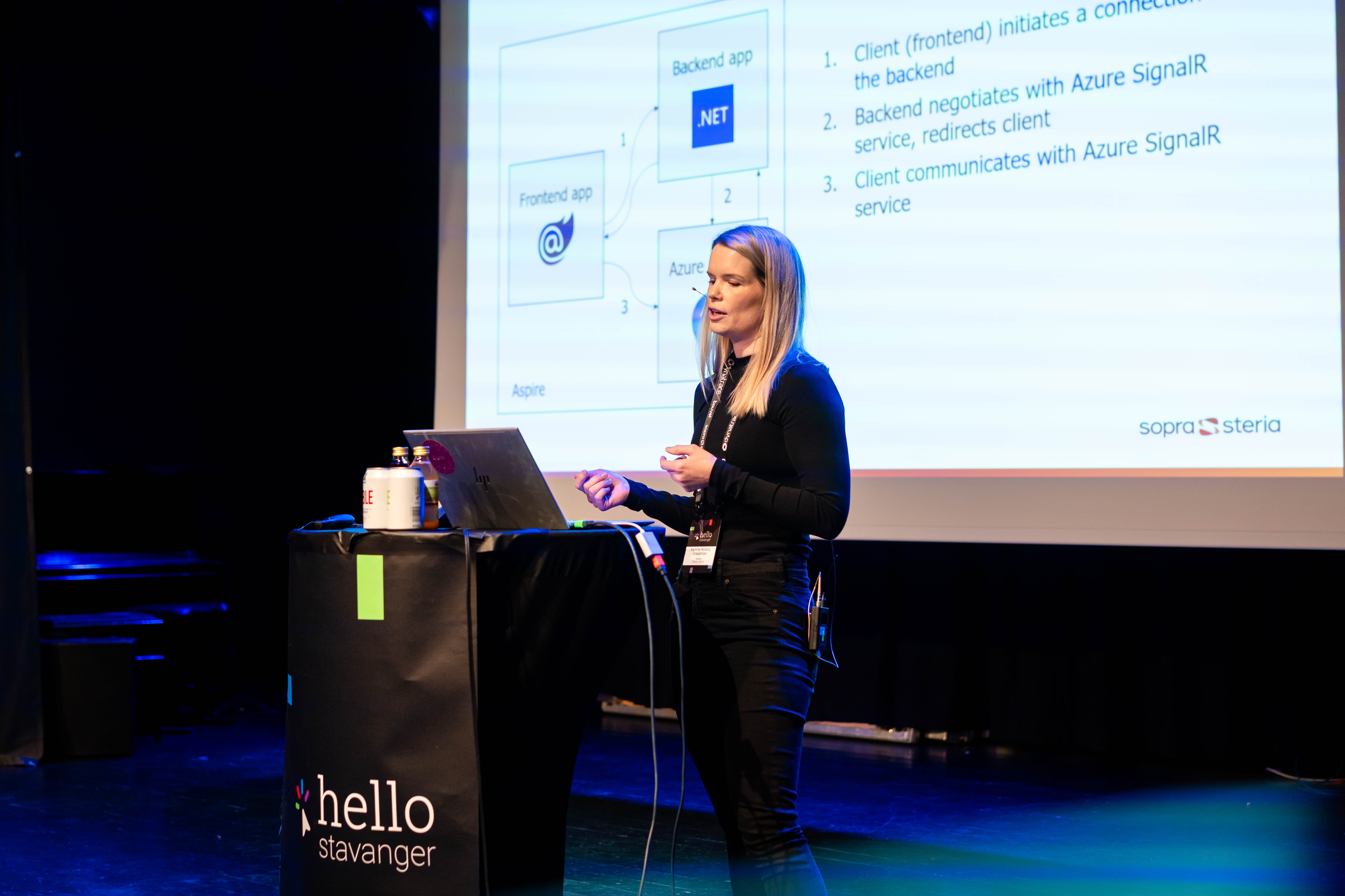 Og en av de spennende oppgavene var å stå på scenen under utviklerkonferansen Hello Stavanger. Fra scenen delte hun tre grunner alle som jobber med .NET og Azure bør være klar over. Azure SignalR og Aspire adresserer nemlig to store utfordringer i moderne applikasjonsutvikling: sanntidskommunikasjon og kompleksiteten i distribuerte systemer.
