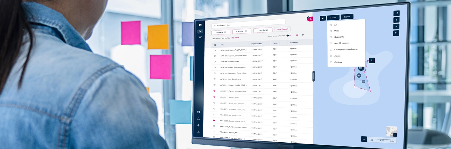Aker BP har store mengder data: prosessdiagrammer, arbeidsordrer, seismisk informasjon, sensordata og annen informasjon knyttet til produksjonsprosessene. Ofte lagres disse dataene flere steder, i ulike formater, og det kan være vanskelig å få tilgang til dem. Vår oppgave var å gjøre dataene mer brukervennlige og tilgjengelige, og samtidig legge til rette for nye måter å jobbe på.