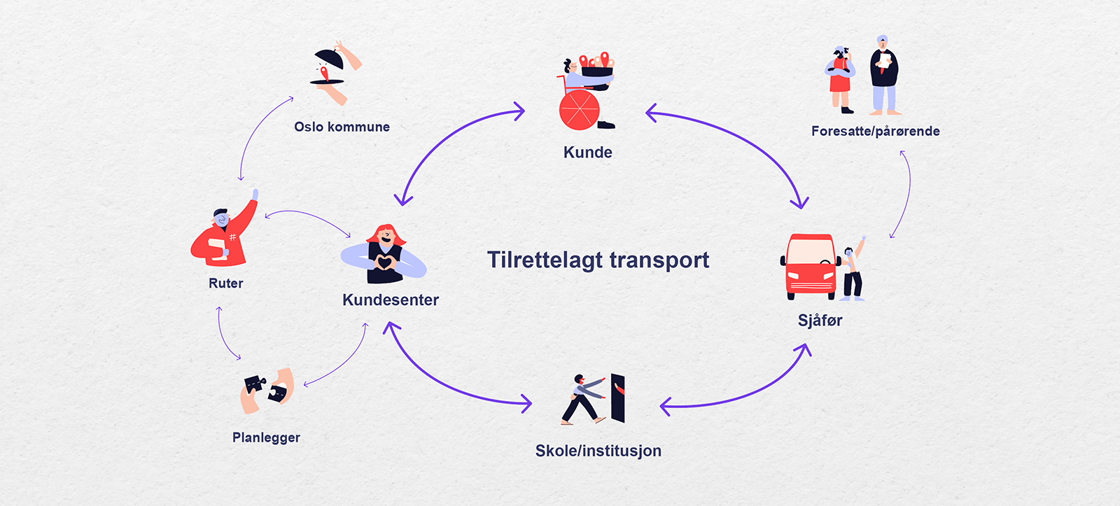 For å sikre en inkluderende tjeneste som dekker behovene til de ulike brukergruppene, har vi samlet innsikt om brukerbehovene. Det kan være vanskelig å komme i direkte kontakt med sluttbrukerne, så vi har heller intervjuet andre viktige aktører: saksbehandlere, kundeservice, skoler, institusjoner, samt representanter fra bydeler og organisasjoner som Norges Blindeforbund (NBF) og Funksjonshemmedes Fellesorganisasjon (FFO). Det har hjulpet oss med å kartlegge felles utfordringer og viktige overganger i tjenesten.
